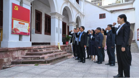 在贺龙军部旧址,全体党员面向鲜红的党旗庄严宣誓,重温入党誓词,向革命先烈致敬。