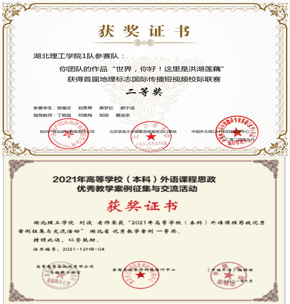 教师的成长与发展显著。在课程思政教学比赛方面,2021年刘俊老师获“高等学校(本科)外语课程思政优秀案例征集与交流活动”湖北省优秀教学案例一等奖,2024年再次获得该项赛事一等奖;2024年9月,陈维维老师在全国高校外语课程思政教学案例大赛中荣获特等奖。