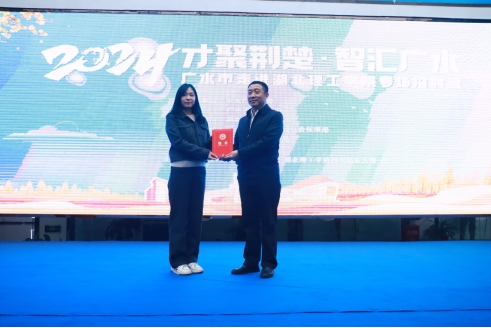 招聘会上,吴军向永利官网招生与就业工作处处长罗建军授牌,并为工作人员陈媛媛颁发“引才大使”聘书。