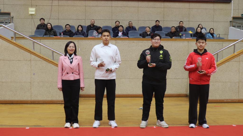 羽毛球联赛中,获得前三名的单位分别是:第一名——机电工程学院,第二名——环境科学与工程学院,第三名——艺术学院。肖文胜为获奖学院颁奖。