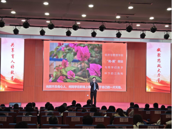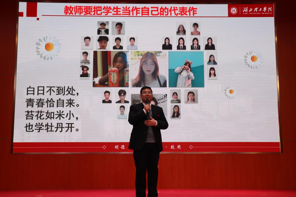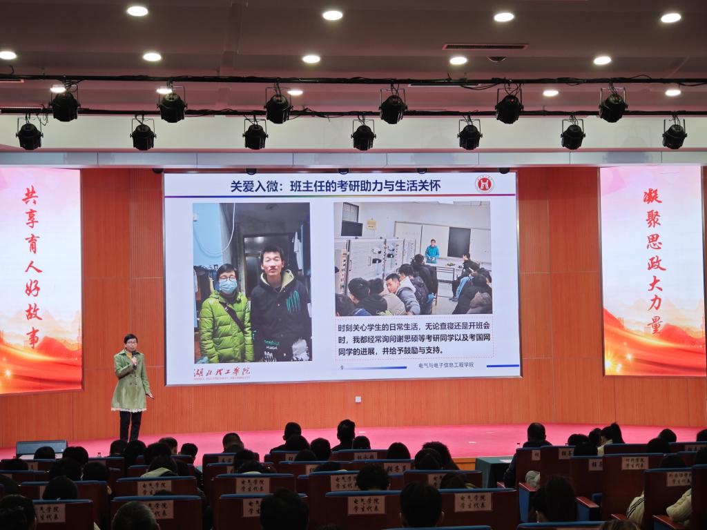 2024年黄石市优秀班主任闵建华、2023年度入围全国最美高校辅导员推选展示者王振华分别与学生以“情景再现”的形式,呈现日常工作中学生交流谈心的场景。计算机学院刘雨喆、师范学院俞思琴讲述“我眼里班主任、辅导员”。
