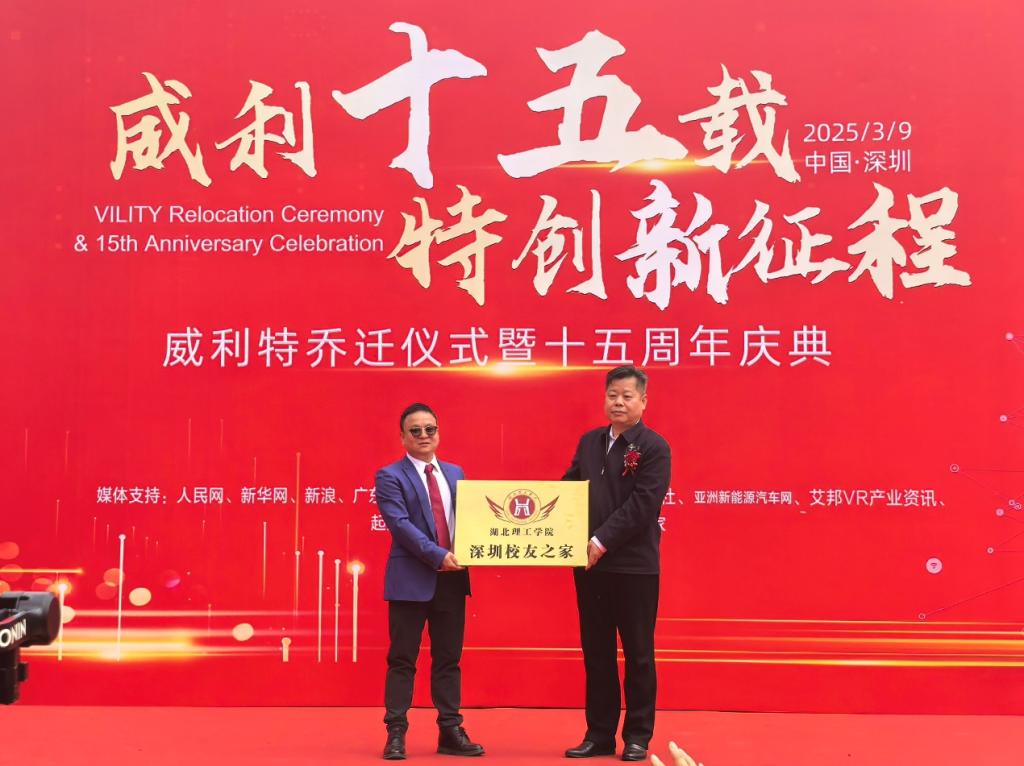 冯运仿一行还参加了深圳市威利特自动化设备有限公司十五周年庆典,并代表学校校友总会授予了深圳凌雄科技有限公司、深圳市威利特自动化设备有限公司“永利集团88304官网深圳校友之家”牌匾。