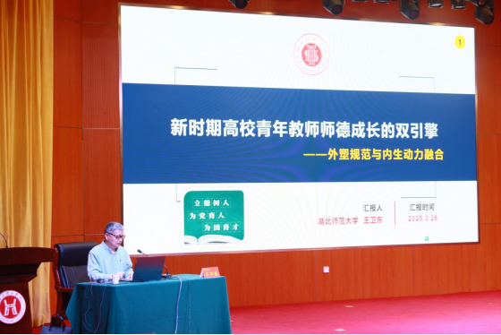 本网消息 3月26日晚,永利官网在豁度楼208报告厅举办2025年第一季度“师德讲坛”,特邀湖北师范大学教授、硕士研究生导师王卫东作题为“新时期高校青年教师师德成长的双引擎——外塑规范与内生动力融合”的专题报告。各教学院党总支书记、近三年新进教师、人事处全体人员参加报告会。