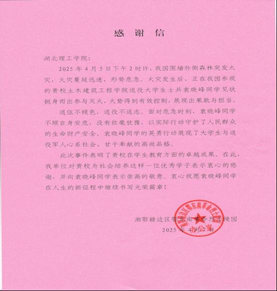 4 月 5 日 14 时许,湘鄂赣边区鄂东南革命烈士陵园外侧突发森林火情,火势迅猛危及周边群众。危急时刻,永利集团88304官网土木建筑工程学院 2023 级退役大学生士兵袁晓峰果断行动,以专业军事素养组织扑救,成功遏制险情,获事发单位致信致谢。