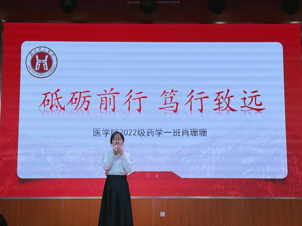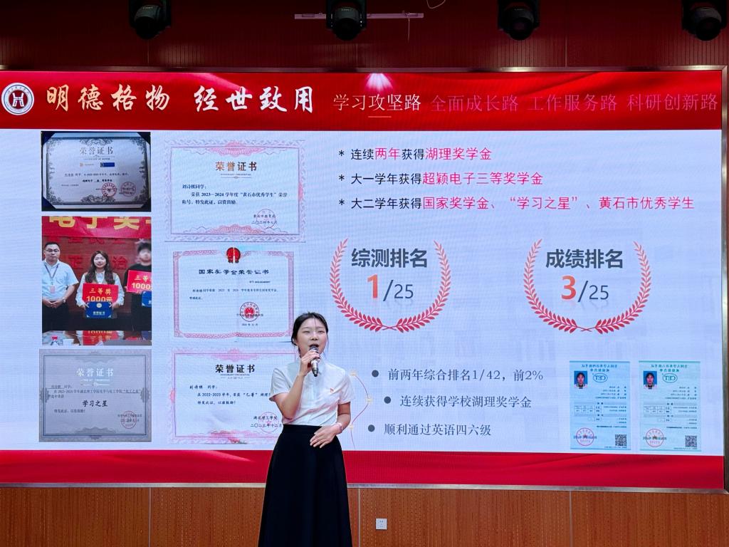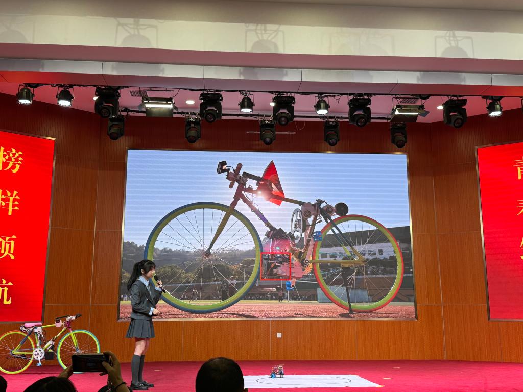 标兵不仅是荣誉的象征,更是实践与创新的引领者。电气与电子信息工程学院程好同学展示了科技设计作品智能寻迹小车和无人驾驶自行车,她是学术领域取得突破的科研先锋;机电工程学院陈鑫同学分享了3D打印创业经历和作品,他兼具竞赛实力与创业魄力,更以敢为人先的勇气,将所学知识转化为创业实践;艺术学院朱秋亦同学介绍了自己设计的国际传播中国古代数学成就的APP——古算雅集,她以平面设计为媒介,探索传统文化与现代设计的融合创新。三位标兵以创新实践的执着追求为底色,在青春的赛道上奋力奔跑,用过硬的专业技能诠释了科技创新的力量与永攀高峰的精神。