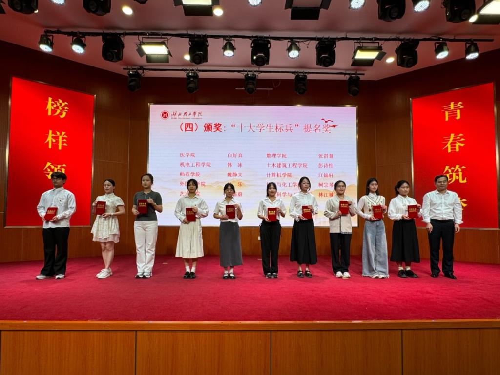 青春,是人生中最璀璨的华章,充满了无限的可能;榜样,是前行道路上最明亮的灯塔,指引着我们奋勇向前。校第十届“十大学生标兵”评选活动自3月份启动以来,吸引了众多优秀学子报名参选。本次评选活动按照初赛、决赛和事迹风采展示三个阶段开展,经学院推荐和辅导员评审,共有20名候选人入围决赛。决赛由学生网络打分、事迹材料评分,学工部、各教学院党总支副书记现场评分构成。最终,土木建筑工程学院傅若琳同学、材料科学与工程学院李蔓同学、化学与化工学院刘诗棋同学、电气与电子信息工程学院程好同学、数理学院殷宜萍同学、经济与管理学院程凯同学、外国语学院江硕同学、机电工程学院陈鑫同学、医学院肖珊珊同学、艺术学院朱秋亦同学获评第十届“十大学生标兵”奖。医学院白好真同学、机电工程学院韩冰同学、师范学院魏静文同学、外国语学院吕乐同学、艺术学院孙嘉蔚同学、数理学院张淇慧同学、土木建筑工程学院彭诗怡同学、计算机学院江锦轩同学、化学与化工学院柯宗琴同学、环境科学与工程学院林江城同学获评“十大学生标兵”提名奖。