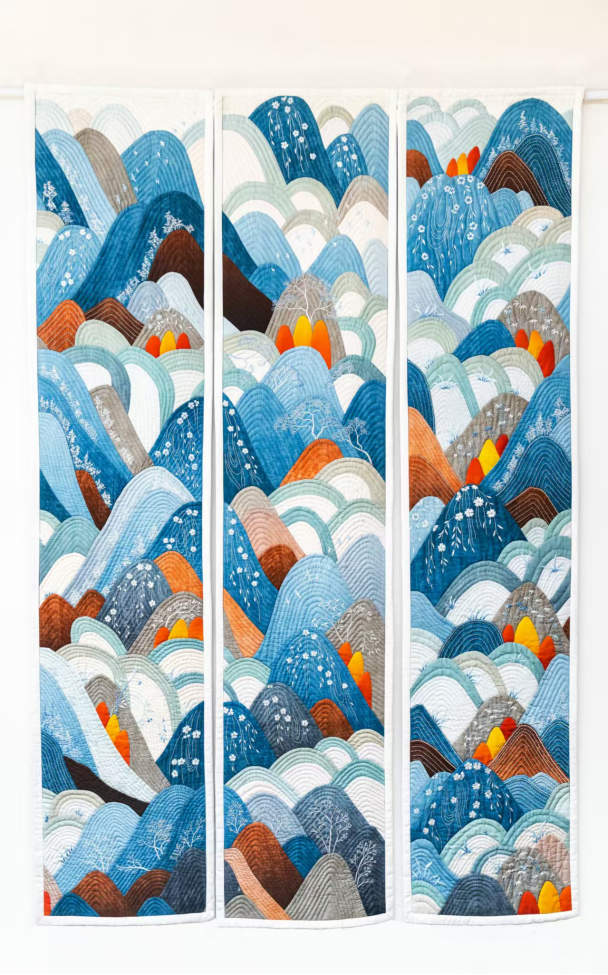 殷海霞老师的非遗拼布绣作品《百衲汇山河》,通过提炼和简化的手法,运用不同色彩纹理的布料和绣线拼缝刺绣,汇聚成一幅色彩层次丰富、和谐、明快的山河景象,体现了统战历史中各方力量的汇聚融合。