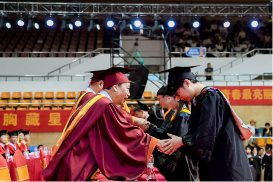 学位授予环节庄重而温馨,全体校领导为获学士学位代表拨穗正冠、颁发证书,每一个动作都饱含对毕业生的祝福,定格青春重要里程碑。
