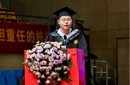 医学院2021级药学专业学生蔡张豪作为优秀毕业生代表发言。他表达了对母校栽培的感恩之情,并认为在湖理四年学习、实践、双创与考研的磨砺,让其懂坚持与成长,是终点更是起点。他呼吁大家携“明德、格物、经世、致用” 底气出发,做胸有丘壑,眼有星光,历经千帆,归来仍是那个在湖理校园里追光的少年。