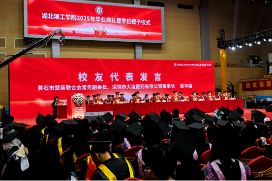 黄石市楚商联合会常务副会长、深圳市大谊医药有限公司董事长蔡华强作为校友代表发言。他表示,在全体师生与广大校友的共同努力下,母校发展日新月异,综合实力持续跃升,社会声誉不断提升。越来越多的优秀校友从这里走向全国各地、各行各业,取得了令人瞩目的成就,成为社会的中坚力量。他祝愿母校根植荆楚,枝繁叶茂;桃李芬芳,誉满神州;愿母校的明天,愈加辉煌灿烂。他从“珍视出身,更要超越出身;传承“理工”底色;终身学习,持续精进;自信自强,敢于亮剑”四个方面寄语毕业生,书写无愧于时代、无愧于母校、无愧于自己的精彩华章。