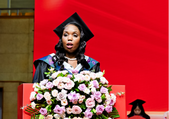 国际学院2019级临床医学专业留学生玛丽作为留学生代表发言,她以《跨越山海逐梦未来》为题,回顾在中国开启的一段精彩求学之旅。五年里,学知识、长才干、交朋友,体验包饺子、过端午等文化活动,感受中国文化与热情。她表示会始终弘扬“艰苦创业、自强不息、敢为人先、开放创新”的理工精神,秉承“明德、格物、经世、致用”的校训,跨越更多的 “山海”,追逐心中的梦想,努力为“一带一路”沿线国家医疗卫生事业发展做出湖理人的贡献。