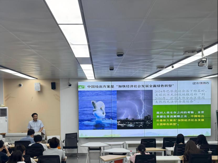 6月18日上午,副校长刘修海以“厚植绿色底气,建设美丽中国”为题,为同学们讲授了我国绿色转型的经验、意义、挑战及趋势等内容。勉励大学生要深刻认识绿色发展对国家未来的战略意义,要以实际行动践行低碳生活,为建设美丽中国和实现中华民族永续发展贡献智慧和力量。