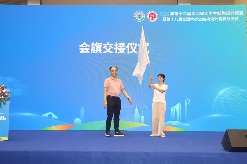 袁焕鑫教授宣布下届大学生结构设计竞赛承办高校为武昌理工学院。袁建议教授与范卫琴教授上台,进行会旗交接仪式。