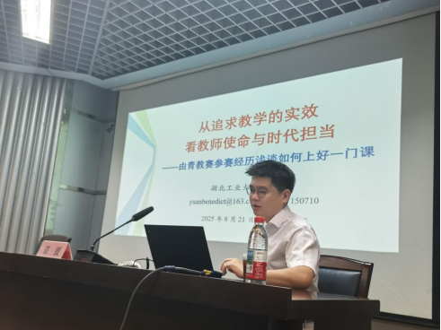 湖北工业大学谌援教授受邀带来“教师使命与时代担当”专题讲座。谌援教授从青教赛参赛经历入手,结合当前教育发展的新形势与新要求,从大学课堂的教学设计角度深入阐释了教育的本质、教师的角色定位、时代赋予教师的使命,激励新教师们要勇于担当时代责任,不断创新教育教学方法,努力培养适应社会发展需要的高素质人才。