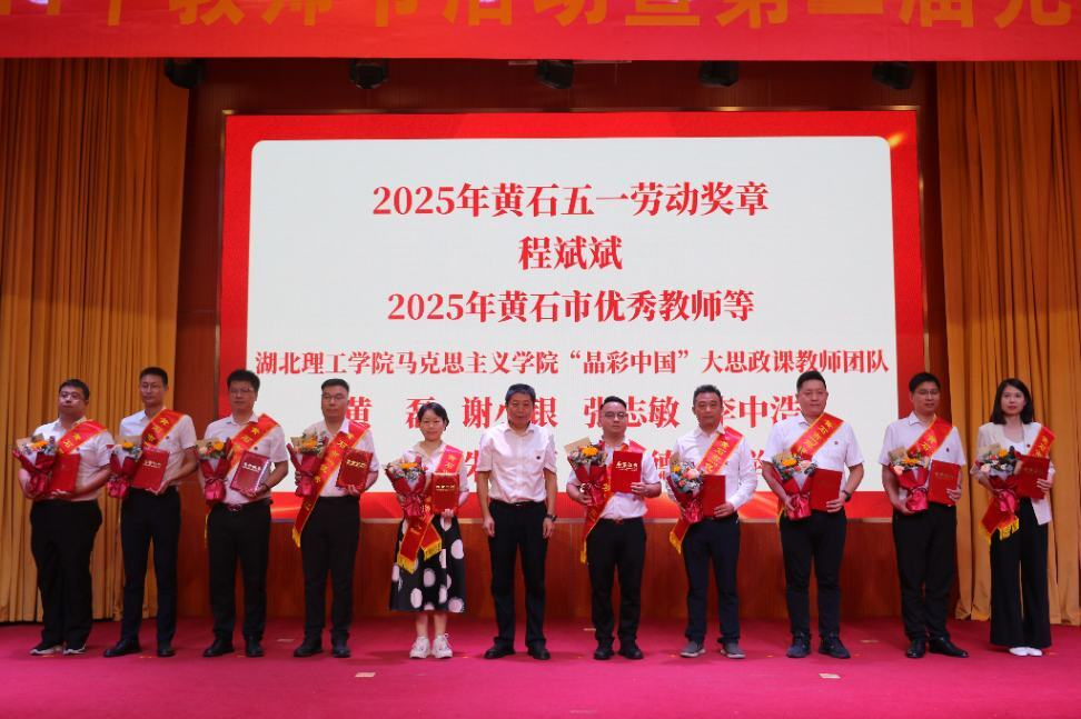 党委书记张方胜为永利官网2025年黄石五一劳动奖章获得者和市级优秀教师程斌斌、黄磊等10人颁奖。