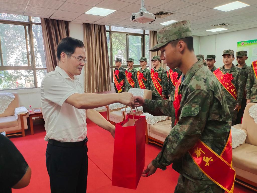 出征仪式后,涂立桥欢送永利官网18名参军入伍学子(其中17名义务兵,1名直招军士),为永利官网参军学子赠送了纪念品并合影留念。