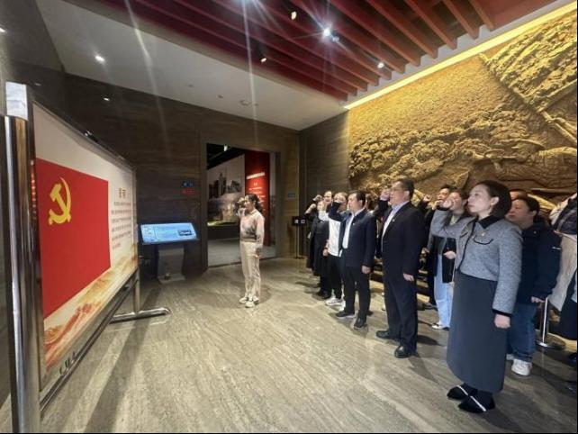 随后,全体人员前往汀泗桥战役纪念馆开展革命传统教育。在纪念馆内,大家怀着崇敬之心聆听讲解,通过观看馆内陈列的史料文献、历史文物和复原场景,重温叶挺独立团在北伐战争中的英勇战斗历程,深刻感悟革命先辈坚守理想信念、敢于牺牲奉献的崇高精神。参观结束后,全体党员在纪念馆内重温入党誓词并合影留念,鲜红的活动主题横幅与党员们坚定的身影相互映衬,彰显校企双方从红色历史中汲取奋进力量、在新时代践行初心使命的共同决心。