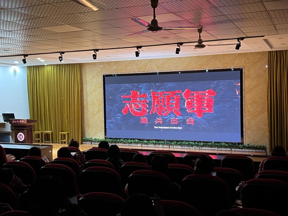 为纪念中国人民志愿军抗美援朝出国作战74周年,进一步弘扬爱国主义精神,10月10日晚,外国语学院在X2-113活动室组织了一场特别的观影活动,组织学生集体观看了以抗美援朝为背景的电影《志愿军:雄兵出击》。随着剧情的推进,大学生们仿佛穿越时空,回到了那个战火纷飞的年代。他们被志愿军战士们的坚定信念、无私奉献和壮烈牺牲深深打动。许多同学在观影过程中热泪盈眶,为英雄们的壮举而感动、为祖国的强大而自豪。观影结束后,现场举行了热烈的交流分享会。同学们纷纷踊跃发言,分享自己的观影感受。一位同学激动地说:“这部电影让我深刻地认识到了抗美援朝战争的伟大意义,志愿军战士们用生命和鲜血捍卫了国家的尊严和荣誉,他们是我们永远的英雄。作为新时代的大学生,我们要铭记历史,传承红色基因,努力学习,为实现中华民族伟大复兴的中国梦贡献自己的力量。”