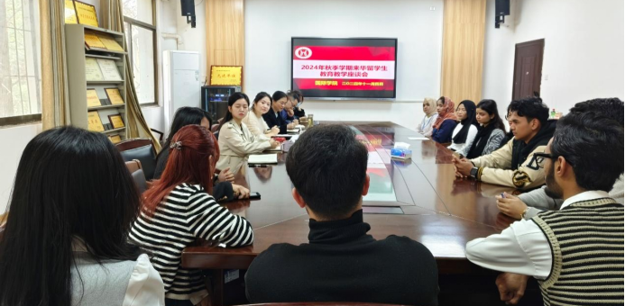 本网消息 11月4日上午,国际学院在教I楼401会议室召开2024年度秋季学期来华留学生教育教学座谈会,深入贯彻学校教育教学“质量文化”建设月活动精神,进一步加强国际学院的质量文化建设,不断提升永利官网来华留学生的教育教学质量。本次会议由国际学院教学副院长李雅颖主持,学院党总支书记郭淑英、对外汉语教研室主任缪杉莎、辅导员黄亚、程紫雨、教学办万晓星老师以及各班留学生代表参加。