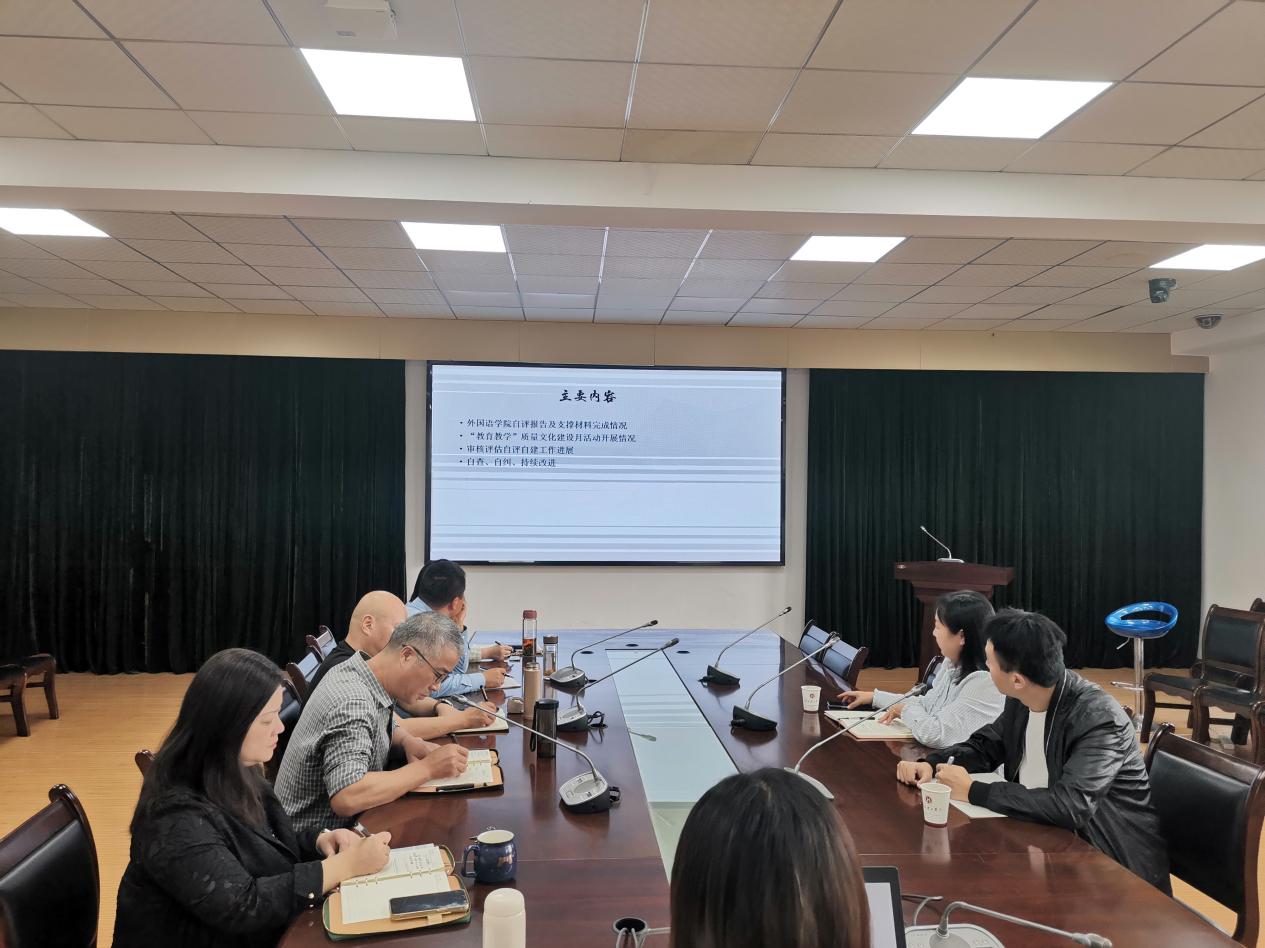 外国语学院副院长张嵋琳围绕本科教育教学审核评估自评报告及支撑材料完成情况、“教育教学”质量文化建设月活动开展情况、审核评估自评自建工作进展和自查、自纠、持续改进情况等方面进行了汇报。与会人员就审核评估其他工作进行了深入的交流。(通讯员 任玉婷)