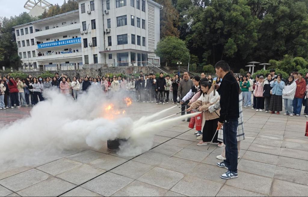 演练开始前,各班长清点人数,强调注意事项。急促的警报声将全体学生带入了模拟学校发生火灾的情境中。志愿者向全院学生发布掩住口鼻、弯腰前行、有序、小跑疏散指令。各班在安全员的有效组织下,有序撤离教室前往广场参加演练活动。保卫处消防科科长张建发向同学们详细讲解了消防器材的操作使用方法,并进行现场操作演示,同时组织学生分组进行灭火器实物演练。