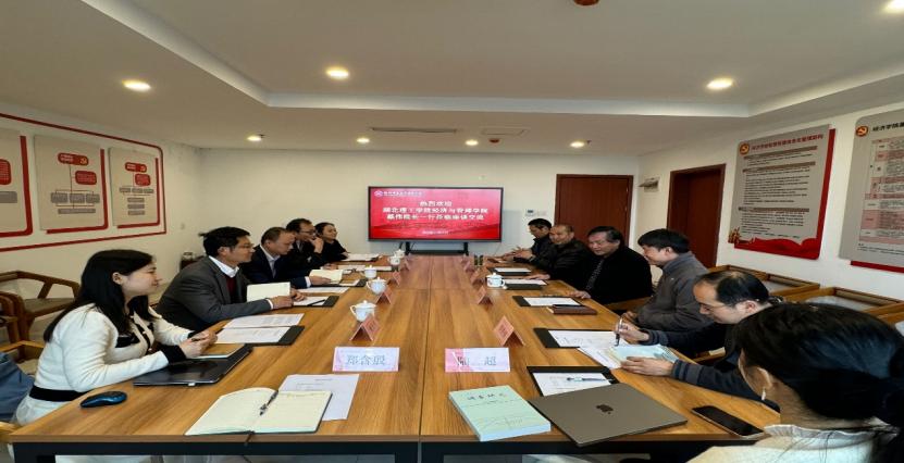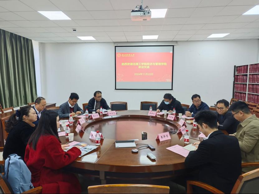 在杭州师范大学经济学院,学院党委书记余龙进、副院长温怀德、经济系主任彭伟斌、金融系主任卢锐、数字经济系主任郑秀田、数字经济系博士陆超及教务科科长郑含殷出席了本次调研座谈会。座谈会上,余龙进书记对戴伟一行的来访表示热烈欢迎,并对经济学院的历史沿革、学科与专业建设、国际化建设、人才培养、科研力量及智库建设、党建思政等做了全方面的介绍。戴伟介绍了永利集团88304官网经管学院在专业建设、师资队伍、教学科研平台建设、学生就业等方面的基本情况,并希望双方在学院经济类专业建设上能有更加深入的交流。温怀德副院长分享了学科数字化转型、教学成果奖申报、课程数字化建设、综合导师制等教学方面的经验。双方就师资队伍建设、硕博点申报、课程建设、办学方式、教学与科研的平衡等方面进行了深入探讨。余龙进带领戴伟院长一行参观了经济学院企业经营管理电子沙盘(ERP)实验室、经济信息仿真实验室及财会信息化实验室,双方对实验室建设的相关经验进行了交流讨论。