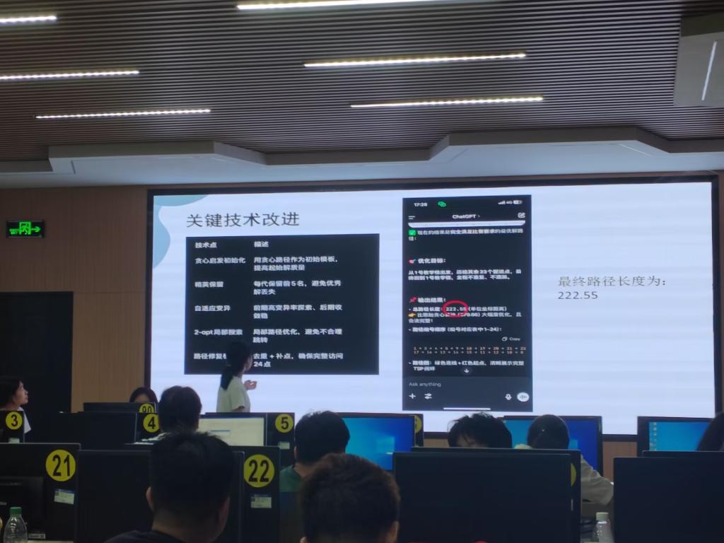 本届比赛主题是鼓励学生在AI工具的辅助下,灵活运用算法和编程语言来解决大学校园外卖配送路径优化问题。参赛的22级工商管理专业学生罗玉银表示,Z世代大学生就是要敢想敢做,虽然她之前并没有上与计算机编程和智能算法相关的课程,但是通过自学,很快就掌握了相关知识,并将其应用于解决实际问题。