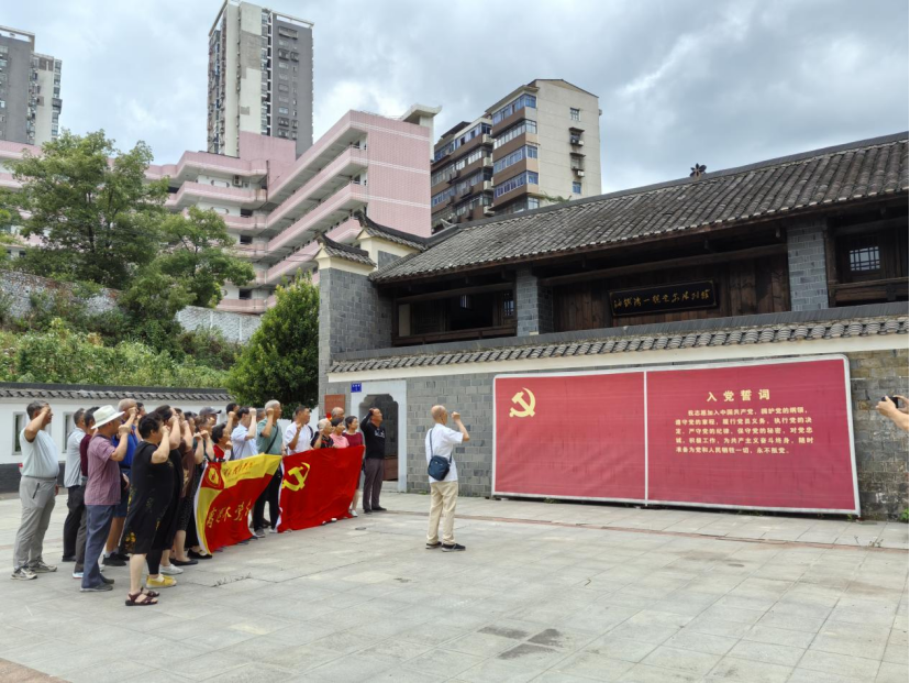 老同志们来到上窑油铺湾1号党史陈列馆,这座徽派风格的百年老建筑于2019年被列为黄石市历史建筑。它是黄石早期共产党人和进步工人开展革命活动的重要场所,是中国共产党黄石历史的重要见证,也是党的历史长卷中的重要一页。离退休老党员们在此进行党史学习教育,旨在学史明理、学史增信、学史崇德、学史力行。在本次活动年龄最大的老党员、九十岁的龚克老师带领下,各党支部书记和老党员们面对鲜红的党旗,举起握拳右手,重温入党誓词。