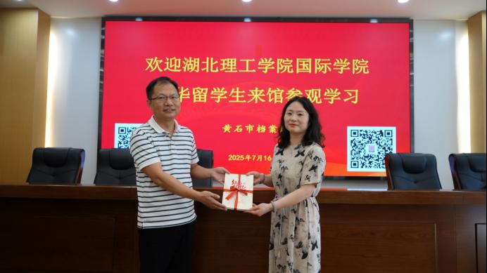 参观结束后,全体同学在市档案馆五楼会议室认真观看了市档案馆今年精心制作重磅推出的《珍档探秘——档案背后的黄石近现代史》短视频。《珍档探秘》让黄石跌宕起伏的近现代史鲜活呈现,一举“圈粉”了现场的留学生们。市档案馆副馆长李震代表市档案馆还向国际学院师生赠送了地方文化书籍和珍贵馆藏档案的仿真件,鼓励广大留学生们积极探索湖北、融入黄石。