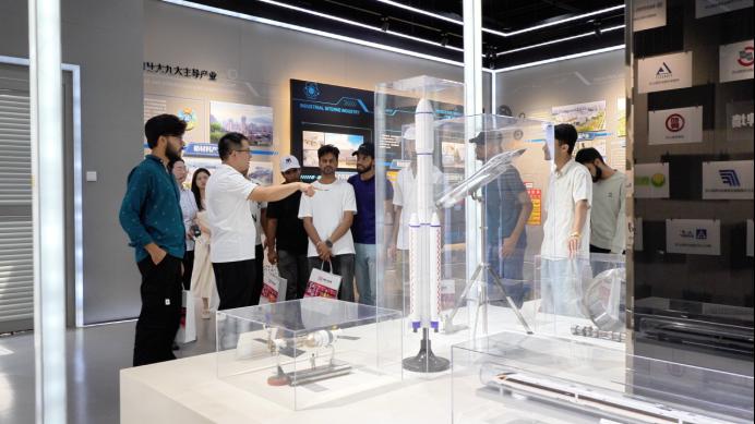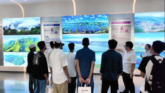 活动第一站,全体留学生来到黄石城市规划展示馆。在讲解员的带领下,全体学生先后参观了序厅、概况厅、历史文化名城展区、先进制造之城展区、山水宜居之城展区、城市总规厅、现代港口城市展区、创新活力之城展区、大冶湖生态新区规划展等功能区。规划展示馆以其多元的展示方式,巧妙串联起城市的过去、现在与未来,让全体留学生沉浸式感受黄石发展的澎湃脉络。从铜绿山古铜矿复原到华新水泥厂房复原、从产业光影设计到现代港口场景,科技结合艺术营造出的沉浸式体验,让留学生们在历史与现代的交融中触摸城市的产业脉络,在光影与场景的沉浸里感知中国的发展温度。
