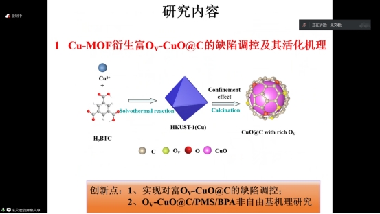 朱文君,毕业于武汉科技大学化学工程与技术专业,获工学博士学位。2023年进入黄石湖理环保节能产业技术研究院有限公司—博士后科研工作站,主要从事MOFs衍生金属氧化物修饰碳纳米复合物缺陷的调控及其氧化降解有机污染物机理等方面的研究工作。博士后研究课题为《MOFs衍生金属氧化物修饰碳纳米复合物缺陷的调控及其氧化机理的研究》,该研究结果在催化应用的缺陷工程方面取得了显著进展,特别关注于开发源自铜金属有机骨架(Cu-MOFs)的富含氧空位的CuO@C催化剂,用于过氧单硫酸(PMS)的活化。该研究展示了一种简便且可控的合成方法,并深入研究了氧空位介导的电子转移的协同效应,促进了以单线态氧生成为主的非自由基降解途径。在站期间,朱文君博士以第一作者发表SCI论文1篇,中文综述一篇,主持矿区环境污染控制与修复湖北省重点实验室联合开放基金、永利集团88304官网校级项目各1项。