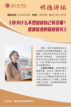 3月23日晚上7点,应师范学院邀请,中南财经政法大学新闻与文化传播学院副院长张雯在腾讯会议平台为师范学院师生进行了《健康信息传播的回避研究》讲座。师范学院副院长谢晨、数字人文“新文科”虚拟教研室全体教师、网络与新媒体专业全体学生参加了此次讲座。讲座由陈旭光博士主持。