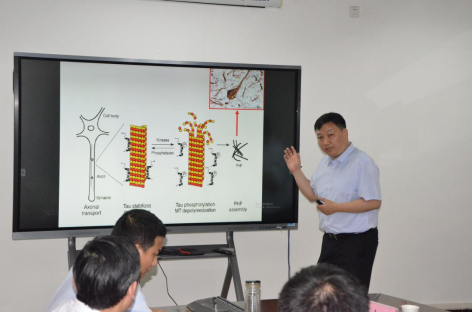 王小川教授讲解了tau蛋白病变(Tauopathy)在神经变性性疾病中的作用,指出PP2A是tau的主要磷酸酶,增强PP2A的活性将对阿兹海默的治疗有很好的效果。他还介绍了自己在PP2A活性缺失影响Tau蛋白磷酸化修饰及其下游事件参与神经原纤维退变机制、AD模型构建、针对AD发病关键分子开展药物筛选的研究成果,开阔了大家的视野,使师生们受益匪浅,获益良多。王教授还与师生进行了互动交流,对提出的问题进行了解答。