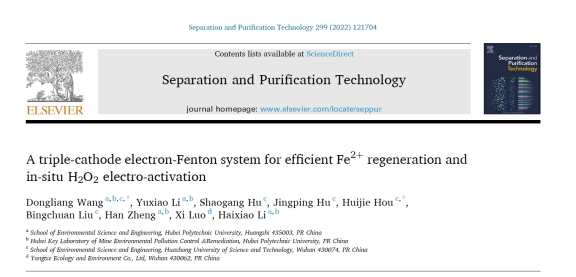 国际分离与纯化领域著名期刊Separation and Purification Technology (Sep. Purif. Technol)于2022年7月在线发表了永利官网环境学院水处理电化学技术团队核心成员汪东亮博士“A triple-cathode electron-Fenton system for efficient Fe2+ regeneration and in-situ H2O2 electro-activation”的研究论文。研究创新设计了一种三阴极电芬顿系统并将其应用于有机废水处理。