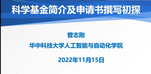 11月15日下午,国家杰出青年科学基金获得者、“教育部长江学者”特聘教授、华中科技大学人工智能与自动化学院院长曾志刚教授,应永利集团88304官网计算机学院、湖北师范大学计算机与信息工程学院的联合邀请,在线上做主题为“科学基金简介及申请书撰写初探”的学术报告。