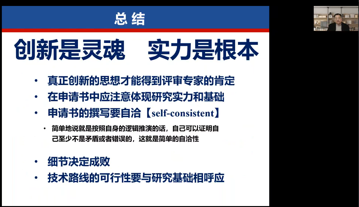 曾志刚教授以“创新是灵魂,实力是根本”对本次讲座交流做了总结,再次强调了基金申报书体现创新思想的重要性,并与参会人员进行了交流。