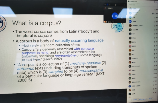 戴光荣教授借由语料库相关的一些基本内容在线与老师们进行了互动问答,基于老师们现有对语料库的认知,围绕语料库的概念、研究范式的转变、如何使用语料库等展开讲授。讲座持续两小时,内容贴近翻译教学和语言研究,戴教授不但清晰地讲解了语料库的研究范式和原理,而且演示了语料库如何服务于课堂教学和翻译研究,既有理论解释,又有案例实操。整场讲座深入浅出,内容生动。戴光荣教授指出,大数据时代翻译教师提升的趋势是“翻译教学能力——翻译研究能力——语料资源整合能力——语料库翻译教育能力”,同时提供了翻译教学资源创新的路径和建设路径等,为老师的教学和科研开启了新思路。同时在云端听讲座的其他院校的老师和研究人员超过两百人。