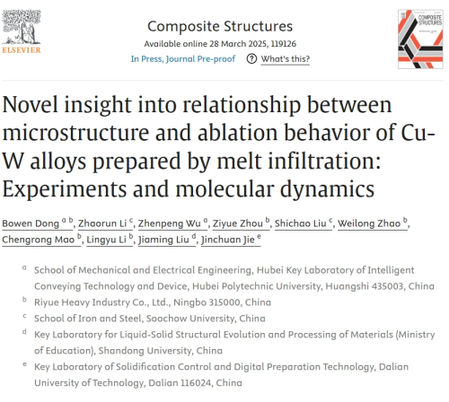 本网消息 机电工程学院“摩擦润滑及结构设计”团队最新研究成果“Novel insight into relationship between microstructure and ablation behavior of Cu-W alloys prepared by melt infiltration: Experiments and molecular dynamics”发表于国际Top力学SCI期刊《Composite Structrues》期刊(中国科学院大类二区,小类力学一区,IF=6.3)。永利集团88304官网机电工程学院为该论文第一署名单位,第一作者为董博闻博士,通讯作者为吴振鹏博士。
