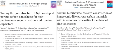 其中,孙雅怡同学在期刊International Journal of Hydrogen Energy发表了以“Tuning the pore structure of N/O co-doped porous carbon nanosheets for high-performance supercapacitors and zinc-ion capacitors”为题的论文,聚焦于多孔碳材料应用于锌离子混合电容器中的研究,以煤沥青为原料,通过“协同成孔”和“气体辅助剥离”技术,成功制备出N/O共掺杂多孔碳纳米片材料。该研究提出了一种简单高效的方法来合成孔隙结构可调的多孔碳纳米片材料,在高性能锌离子混合电容器材料中具有广阔的应用前景。